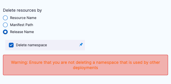 If you select the Delete namespace option, Harness will delete the namespace(s) defined in the release.