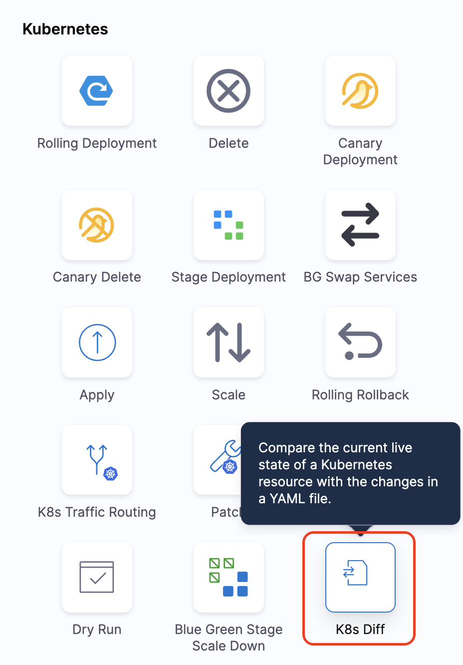 You can add the K8s Diff step anywhere in the Deploy stage. It runs before changes are applied, making it useful for reviewing potential modifications to Kubernetes resources.