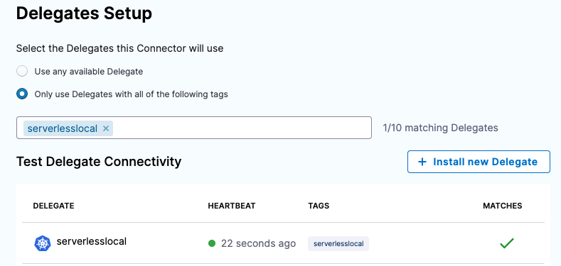 • The delegate pod(s) must have Serverless installed. We'll add the Serverless installation script using the delegate environment variable INIT_SCRIPT to the delegate YAML file later in this quickstart.