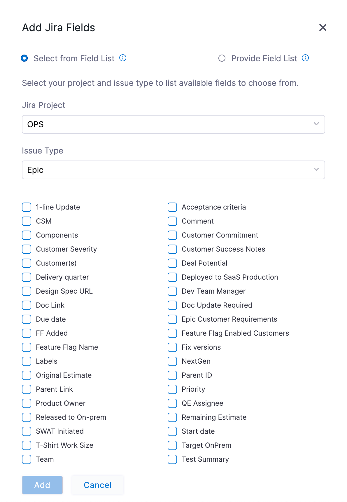 User,Option,Array,Any,Number,Date, andString. For example, multi value fields to allow users to select multiple options from a drop-down list. - Harness does not integrate with Jira fields that manage issue links or attachments.