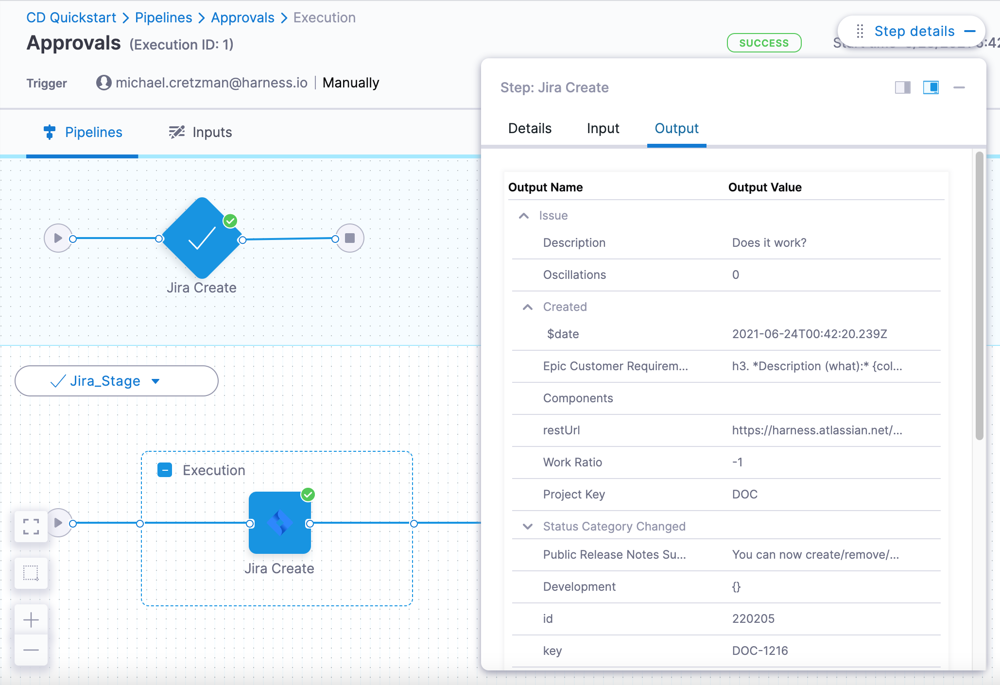 In the pipeline execution view, select the Jira Create step, and then select the Output tab. You can view all the fields for the new Jira issue you created.