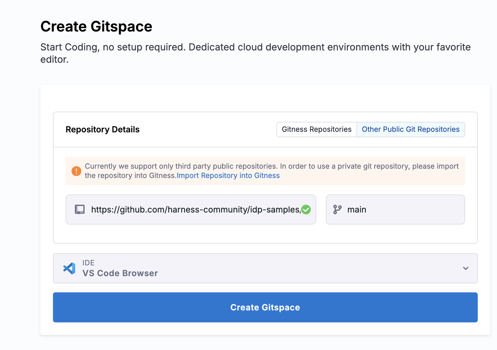 3. Now Create Gitspace, by selecting the default branch as main and IDE.