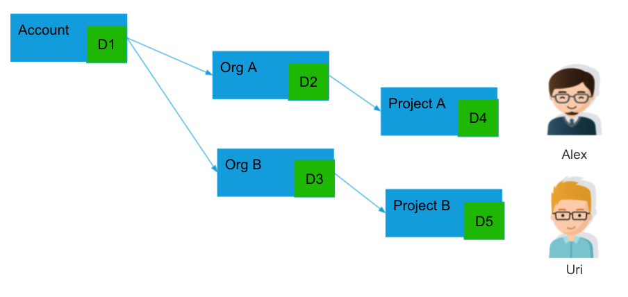 For example, let's look at two users, Alex and Uri, and the delegates (Dn) available to them: