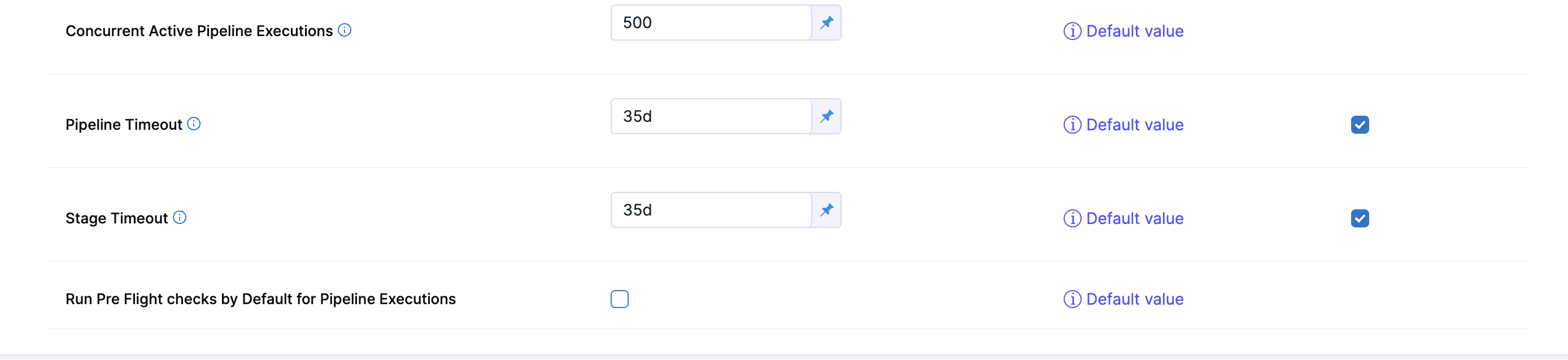 These are the Default Settings available for configuration at the Account scope. You can also configure Default Settings at the Org and Project scopes, but some options are not available at lower scopes.