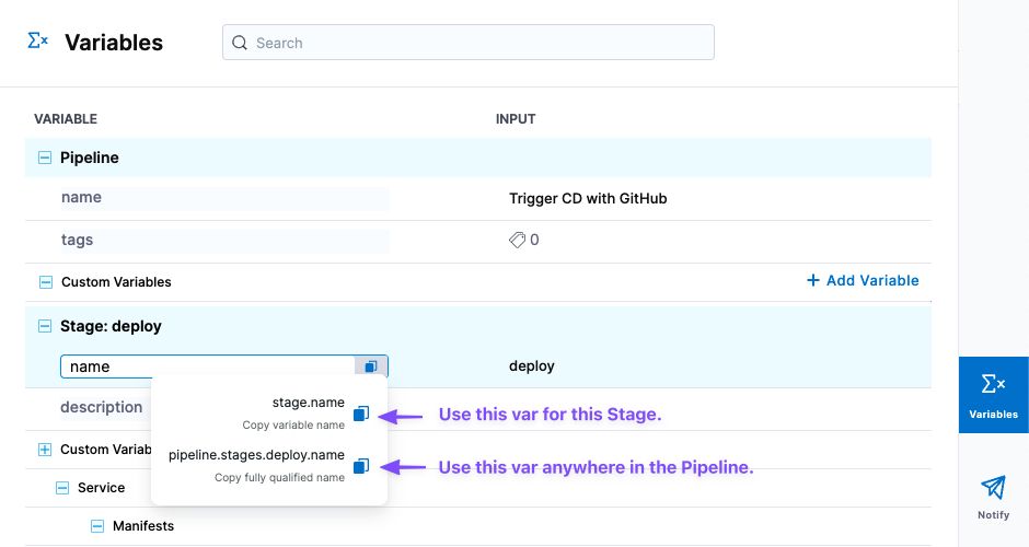 Harness variables are powerful because they enable templatizing of configuration information, pipeline settings, values in scripts, and more. They also enable your pipelines to pass information between stages and settings.