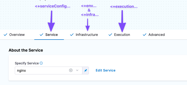 • Service expressions can be resolved only after Harness has progressed through the Service section of the pipeline. Consequently, you can use service expressions in the Infrastructure and Execution sections of the stage.