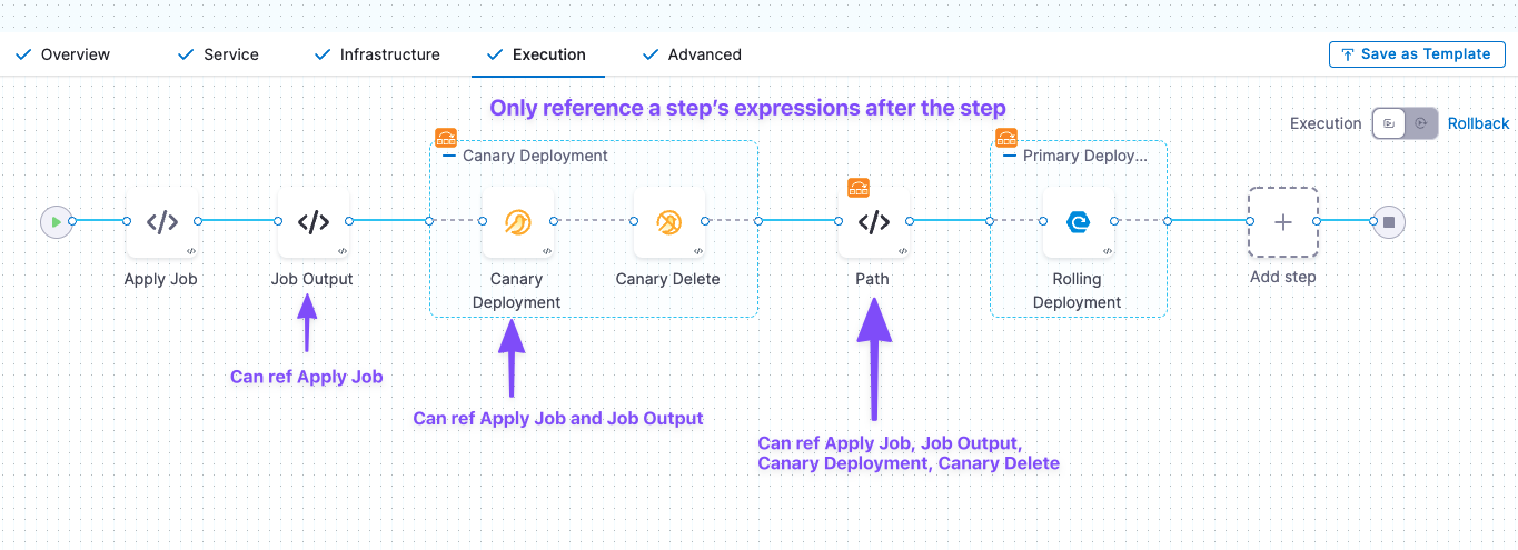 • Each step's Execution expressions can be referenced only after Harness has progressed through that step in the Execution section.