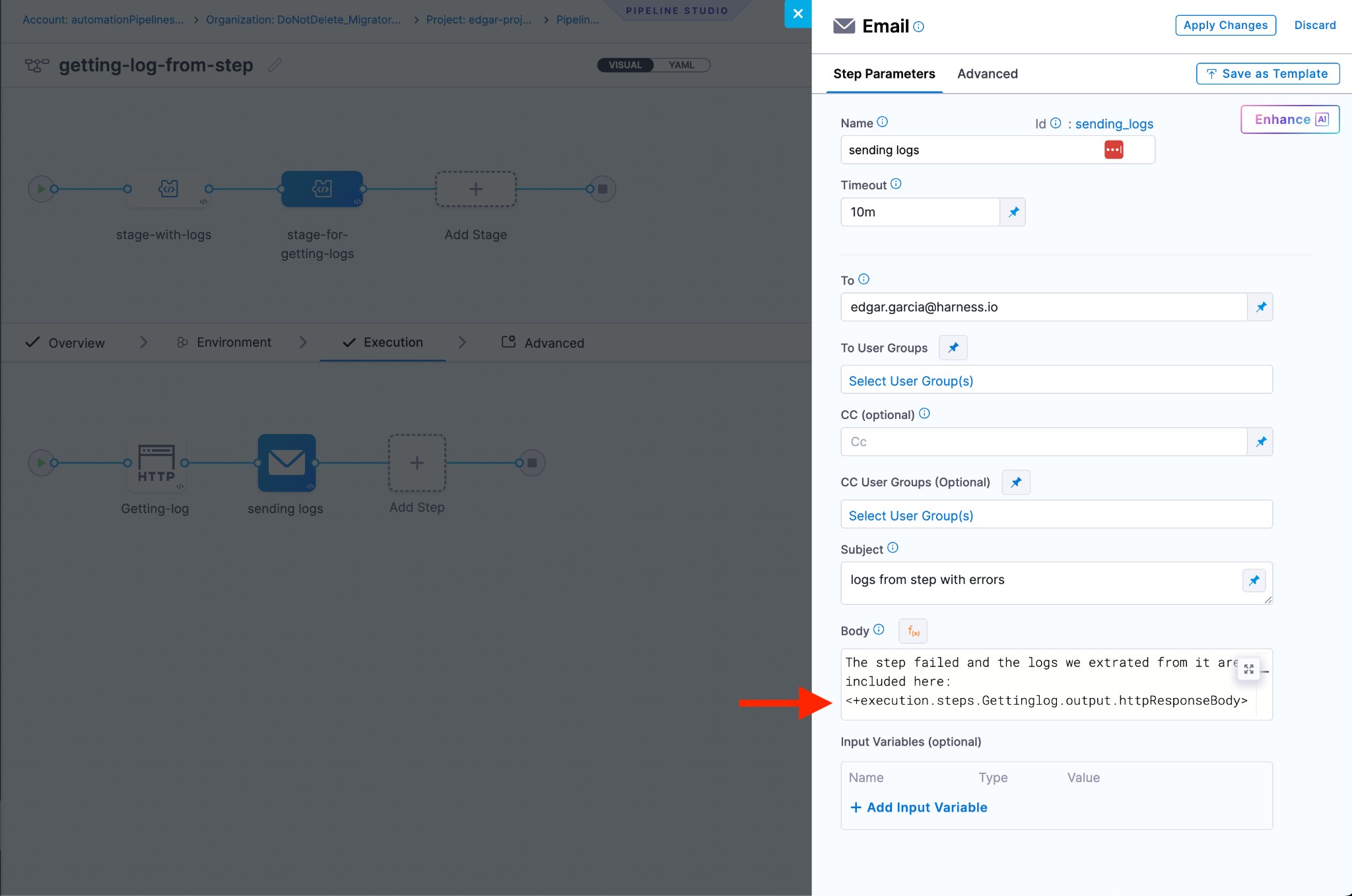 echo <+env.name> # Output example: demo