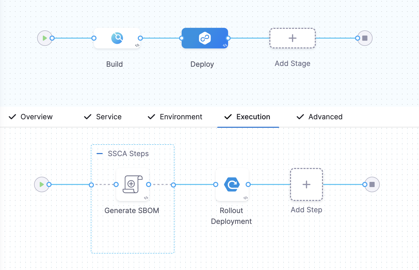 - In a Deploy stage, add the SBOM Orchestration step before the deployment step.